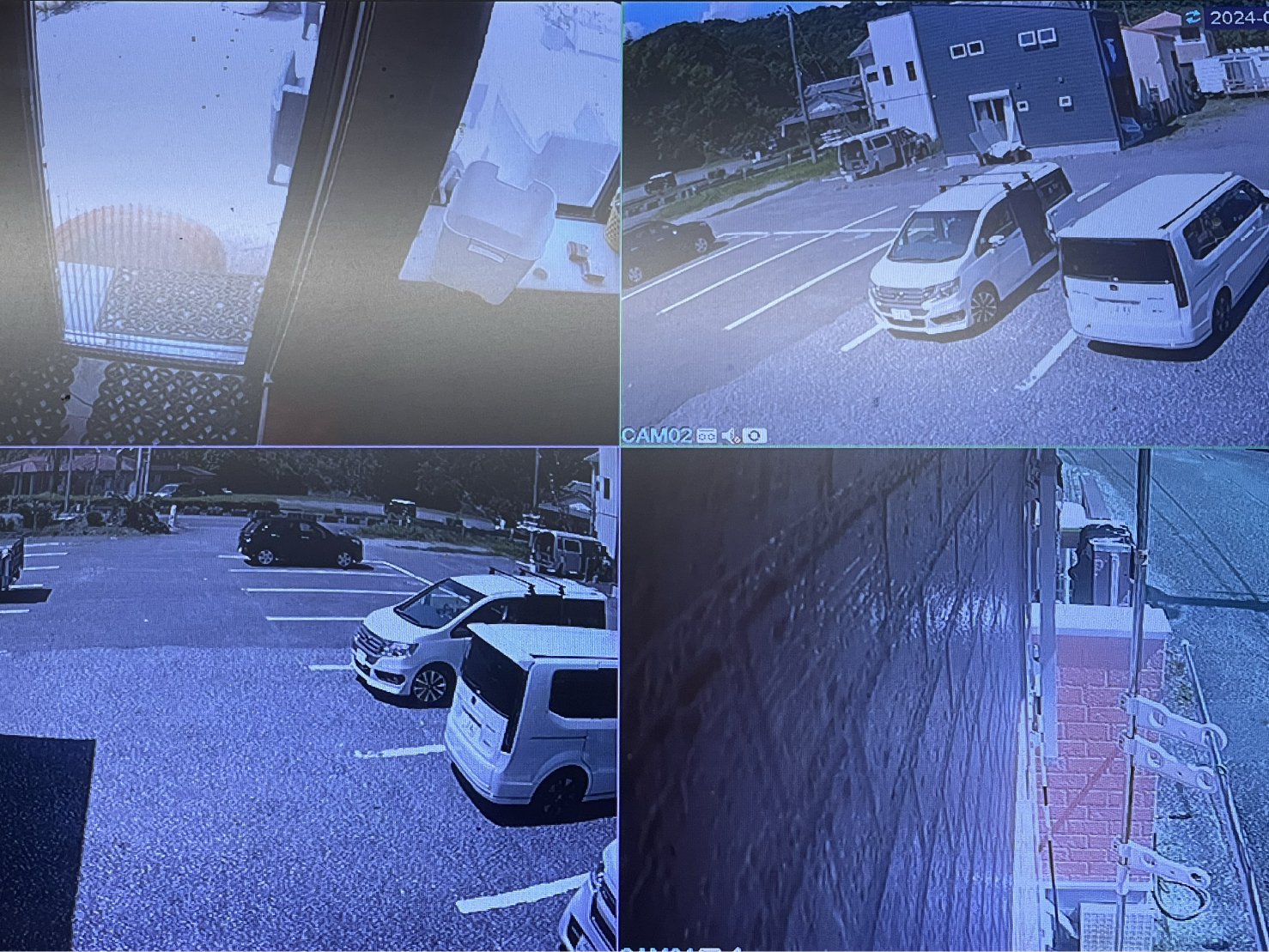 駐車場内や建物内に入る不審者を防ぐため、民宿玄関にはオートロックと敷地内各所に防犯カメラを設置しています。(24時間監視・録画)